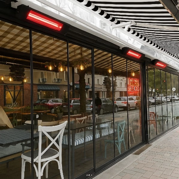 Promienniki GLASS IR wykorzystują jako element grzewczy specjalnie powlekaną lampę halogenowo – kwarcową z włóknem wolframowym, aby dać natychmiastowe ciepło o wysokiej energii. W przeciwieństwie do innych produktów do ogrzewania strefowego te promienniki dzięki zastosowaniu lampy Ultra Low Glare (Rosegold) mają znacznie niższy poziom lśnienia, a użytkownicy czują ciepło i komfort wkrótce po włączaniu. Tafla specjalnego hartowanego szkła z filtrem światła dodatkowo pochłania i redukuje maksymalną ilość blasku z lampy, dzięki czemu Glass-IR zapewniają przyjemne ciepło w wyznaczonej strefie przy zmniejszonej nawet o 90% ilości światła w otoczeniu (w stosunku do standardowych promienników z lampą Gold bez szyby).