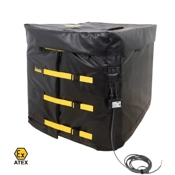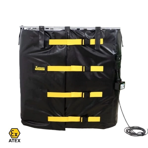 Płaszcze grzewcze duńskiego producenta Kuhlmann Electro Heat do ogrzewania zbiorników IBC są efektywnym rozwiązaniem kiedy wymagane jest utrzymanie dodatniej temperatury substancji przechowywanych w paleto-pojemnikach w nieogrzewanych magazynach w strefach EX. Model 1700W z ATEX zapewnia niezawodne ogrzewanie w niebezpiecznych środowiskach i obszarach zagrożonych wybuchem, jest certyfikowany dla stref 1, 2, 21 i 22. Posiada konstrukcję o klasie ochrony IP65 i trwałą antystatyczną warstwę zewnętrzną z PVC, co zapewnia optymalne bezpieczeństwo i wydajność. Ogrzewacz idealnie nadaje się do trudnych warunków pracy, jest odporny na wodę i pył. Wyposażony został w zintegrowaną, certyfikowaną skrzynkę przyłączeniową z ATEX oraz samoregulujący, wydajny element grzewczy. Idealny do ochrony przed mrozem i utrzymywania dodatniej temperatury zawartości IBC, łączy wydajność i zgodność z najsurowszymi normami bezpieczeństwa.